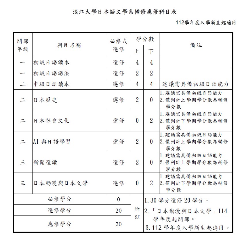 淡江大學日本語文學系輔修應修科目表:112學年度入學新生起