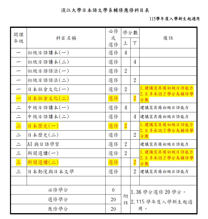 淡江大學日本語文學系輔修應修科目表:115學年度入學新生起
