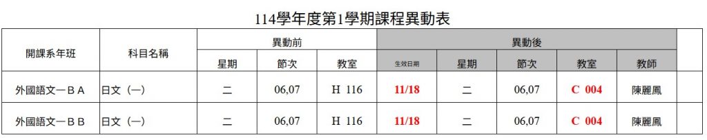 114學年度第1學期教室異動